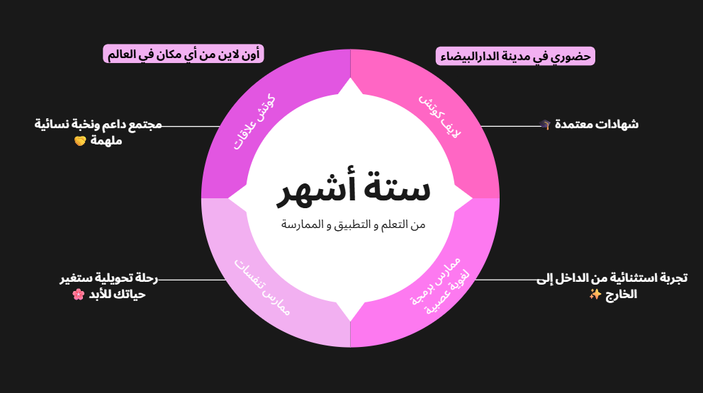 في نهاية هذا البرنامج، لن تحصلي فقط على شهادات معتمدة، بل ستكونين جاهزة للانطلاق في مسار مهني حقيقي ومُلهم، بفضل آليات تطور مهني متكاملة نضعها بين يديك: